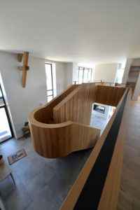 A l’intérieur de cette grange on trouve trois niveaux: un niveau -1 composé d’une cave desservie uniquement par un élévateur intérieur ; un niveau 0 qui s’organise autour un très grand living, une cuisine, un cellier, un wc, une buanderie, un dégagement, un sas, une chambre avec salle de bains, un garage et un local jardin ; et enfin, un niveau 1 composé d’une mezzanine bibliothèque, un rangement, un bureau boudoir, une salle de bains, un wc et deux chambres. L’élévateur intérieur dessert les trois niveaux, mais, un escalier sera créé en supplément pour assurer la liaison entre le niveau 0 et le niveau 1.